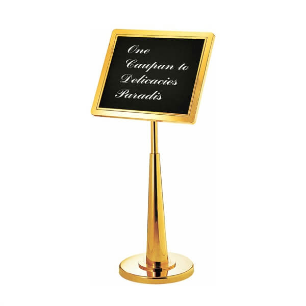 Bảng biển chỉ dẫn mạ vàng dùng cho đại sảnh. Không chỉ được sử dụng trong nhà hàng khách sạn mà còn được sử dụng phổ biến ở hội nghị, tòa nhà, trung tâm thương mại… Bảng chỉ dẫn thông tin sẽ giúp khách hàng tiết kiệm được thời gian. Và thông tin dịch vụ nhà hàng khách sạn mà khách hàng đang quan tâm.