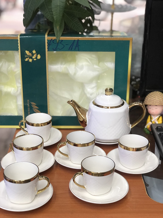 BỘ ẤM CHÉN TRÀ SỨ TRẮNG VIỀN VÀNG SANG TRỌNG mang đến không gian lịch sự, tinh tế . Bộ ấm chén được làm với chất liệu gốm sứ cao cấp, thiết kế đơn giản nhưng không kém phần sang trọng , tinh tế. Bộ ấm chén để tiếp khách mang đến cảm giác thoải mái cho khách đến chơi nhà. Hay dùng trong văn phòng công ty , khách sạn dùng để tiếp khách hàng, đối tác cũng rất phù hợp . Với màu trắng chủ đạo kết hợp với màu vàng sang chảnh phù hợp với mọi không gian từ hiện đại đến cổ điển…