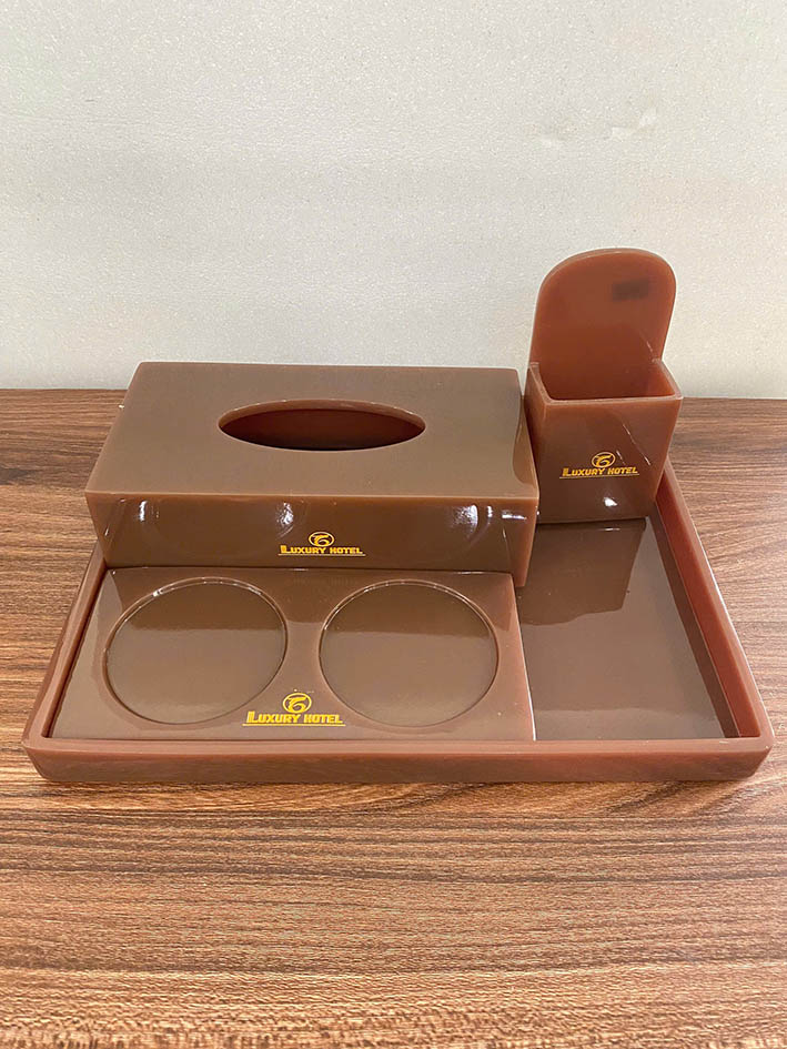 Bộ khay đựng giấy và dụng cụ tiện ích trong nhà vệ sinh là sản phẩm chuyên dụng dành cho khách sạn, resort, hoặc các cơ sở lưu trú cao cấp. Với thiết kế đồng bộ, màu nâu sang trọng và nổi bật, sản phẩm giúp tạo nên sự chuyên nghiệp, sạch sẽ và gọn gàng cho không gian phòng tắm.