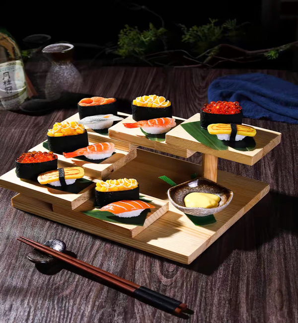 Khay gỗ trang trí món ăn: Mang mùi thơm nhẹ, kháng khuẩn tự nhiên, được ưa chuộng trong nhà hàng cao cấp.