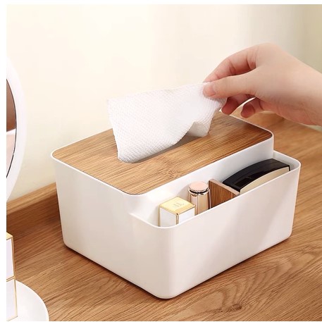 Hộp đựng khăn giấy có nắp bằng gỗ. Không chỉ đựng giấy ăn mà còn trang trí thêm vào ngôi nhà chung của bạn. Chiếc hộp được làm bằng nhựa cứng và mặt gỗ bên trên. Đảm bảo sự chắc chắn. Có thể dễ dàng lấy giấy ra mà không sợ bị rách.